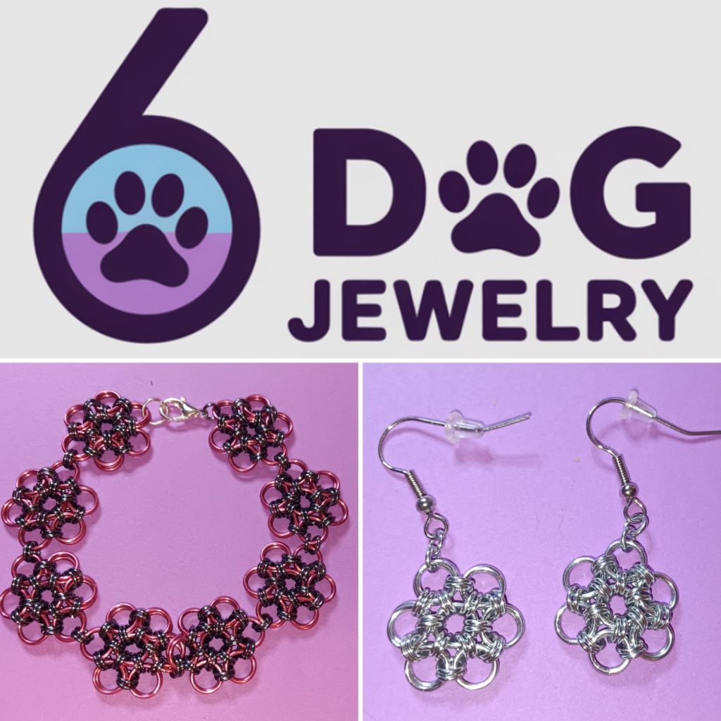 We make handmade jewelry for dogs, and people. Our two families each have 3 dogs, so our name is 6 Dog Jewelry.