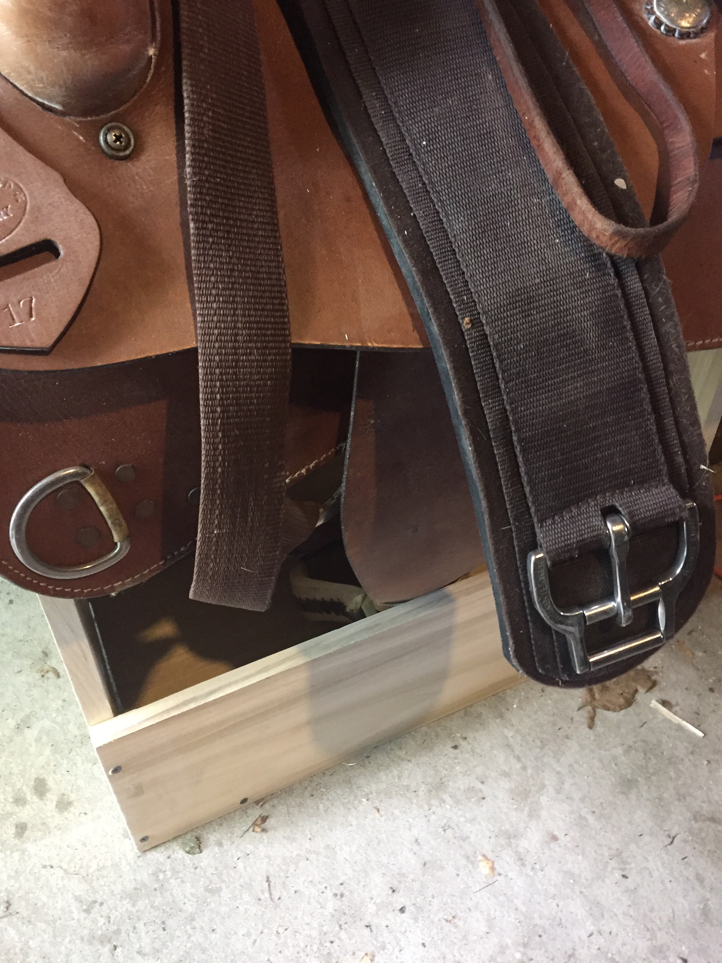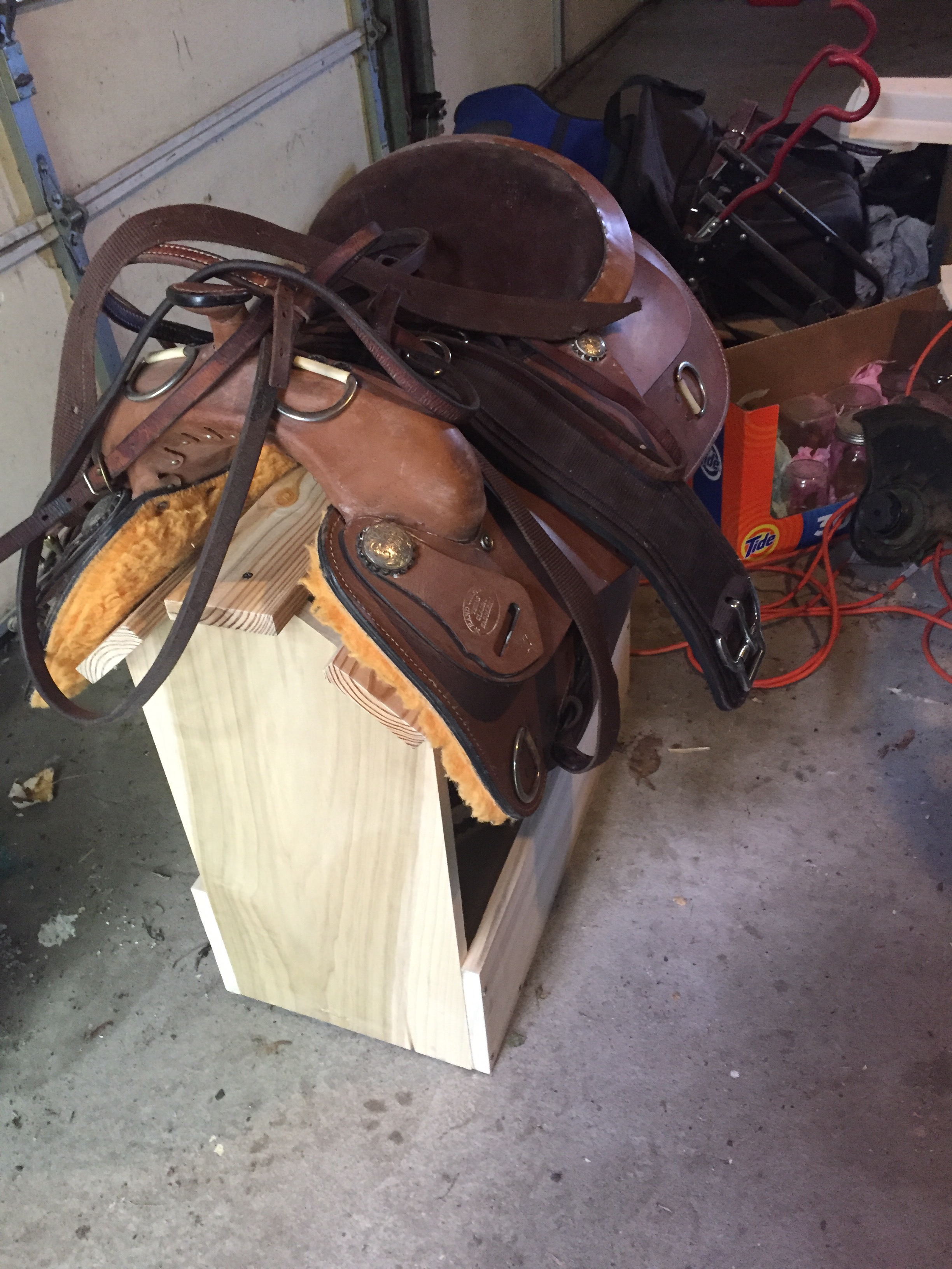 Made a saddle rack this last weekend. Very basic design with a little storage area underneath. Also a good place to have the stirrups go for a larger saddle. Next one I will make a little taller.