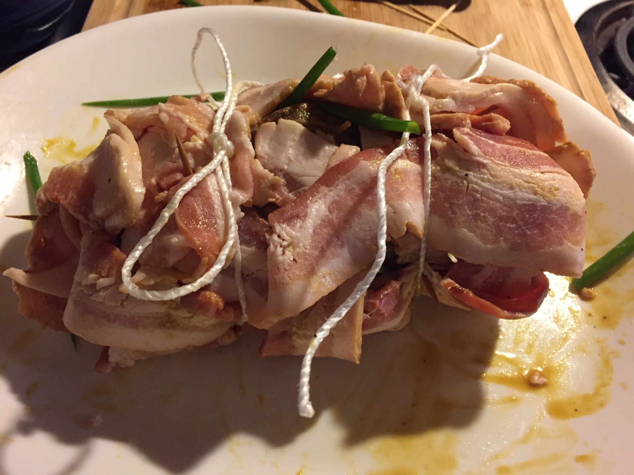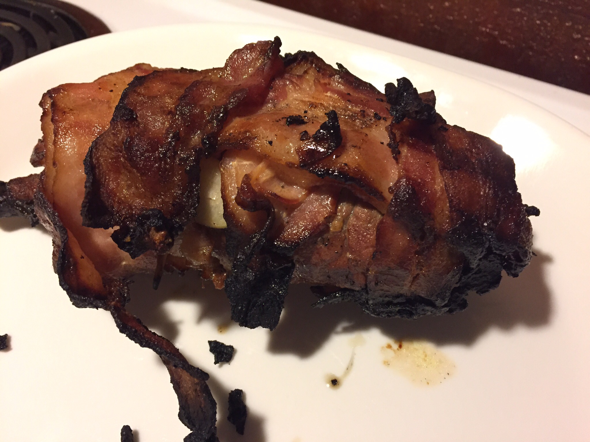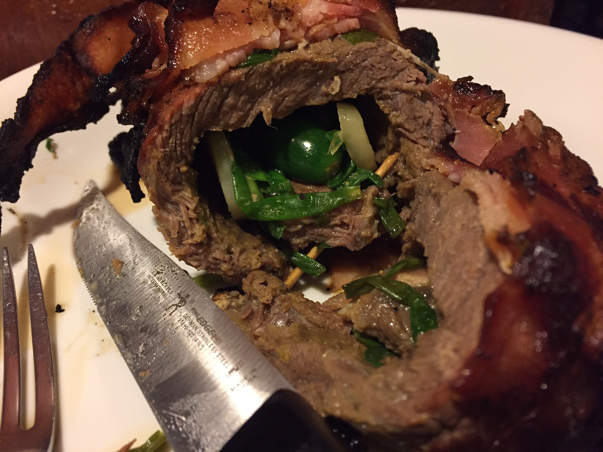 Rain today so posting an experiment I did with some round steak from a few weeks ago. Stuffed with pepper and onion and wrapped in bacon.