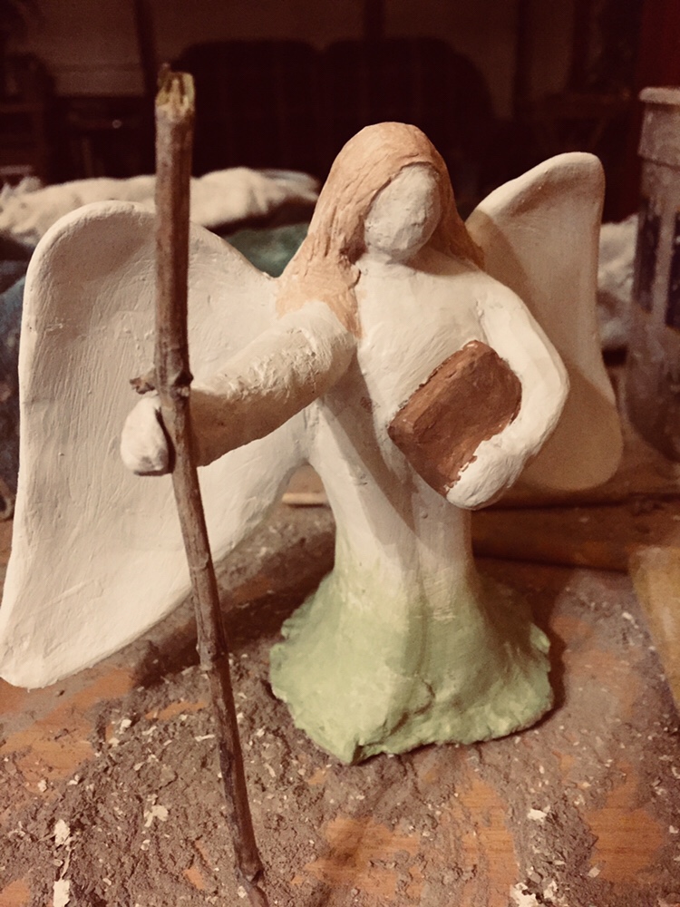 My other Guardian Angel cracked up a bit too much. 😇 So I started over with the clay and carved this out of a solid block of air dry clay. Picture it in some tall grass and it won’t seem as short. So, now I am playing around with painting it. Took two pictures, one in grayscale and the other in a warmer tone in color. So, here is my Guardian Angel.